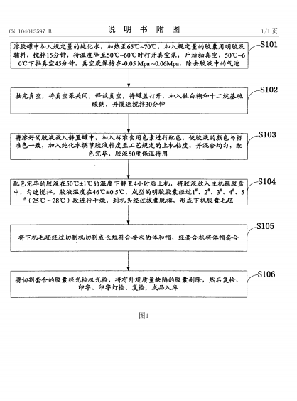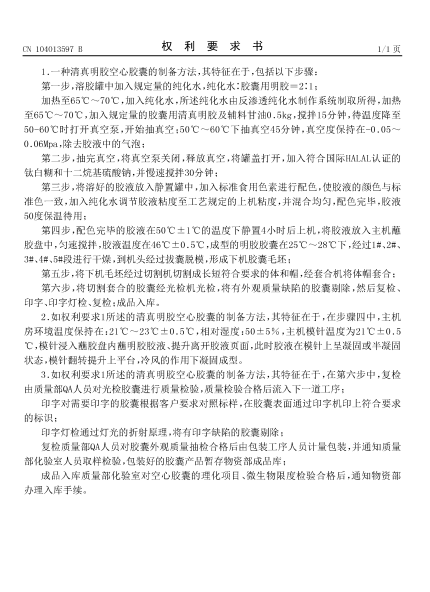 本发明公开了一种清真明胶空心胶囊的制备方法,该明胶空心胶囊的制备方法包括以下步骤:原料检验、清真明胶投料、配色、蘸胶成型、切割套合、光检、复检、印字、印字灯检、复检、清真认证复检、成品入库。本发明制备出了清真明胶空心胶囊,本发明的制备工艺严格、合理,为产品的质量提供了保证,填补了国内清真明胶空心胶囊制备方法的空白。