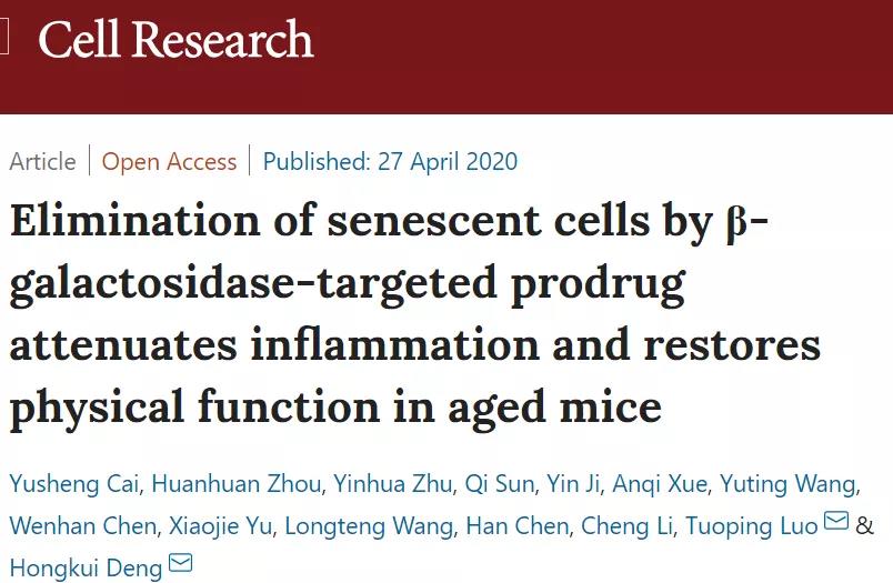 2020年4月27日,来自北京大学的邓宏魁教授研究组与北京大学化学与分子工程学院罗佗平课题组合作在Cell Research上发表了题为Elimination of senescent cells by β-galactosidase-targeted prodrug attenuates inflammation and restores physical function in aged mice的文章,创新性的报道了一种新型的前体药物开发策略,即基于溶酶体β-半乳糖苷酶(β-gal)的活性增加(衰老细胞的主要特征)来设计新化合物。作者基于此开发了新的前体药物SSK1,该药物可以被溶酶体β-gal特异性切割成具有细胞毒性的物质并诱导衰老细胞凋亡,进而清除衰老细胞。在老年小鼠中,该化合物有效清除了不同组织中的衰老细胞,降低了与衰老相关基因的表达,减弱了轻度的局部以及全身炎症,并恢复了其身体机能。这项研究表明,溶酶体β-gal可以作为一个选择性清除衰老细胞的有效靶点,从而为开发抗衰老药物提供了新的策略。