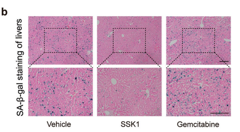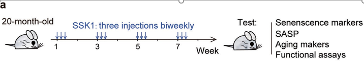 在自然发生的衰老中,SSK1有效减少了衰老小鼠中天然存在的衰老细胞,并且降低了衰老和与年龄相关的标记基因的表达,在局部和全身减轻了衰老相关分泌表型,并且显著地恢复了身体机能。同时,作者也通过一系列实验证明了该药物的安全性。总体而言,这些研究结果表明,通过SSK1诱导SA-β-gal阳性衰老细胞的清除,是缓解与衰老相关功能衰退的安全有效的方法。