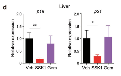 由于Gemcitabine是通过激活p38丝裂原活化蛋白激酶(MAPK)诱导细胞死亡,因此作者检测了细胞在接受Gemcitabine处理后MAPK的磷酸化状态。结果显示SSK1处理后,p38 MAPK和MKK3 / MKK6在衰老细胞中被磷酸化激活。这表明SSK1可以在衰老细胞中被加工成Gemcitabine并激活p38 MAPK信号通路。同时用p38 MAPK抑制剂Birb796,SB203580和SB202190的处理细胞削弱了SSK1特异性杀死衰老细胞的能力。因此,SSK1通过激活p38 MAPK信号传导途径杀死了衰老细胞。