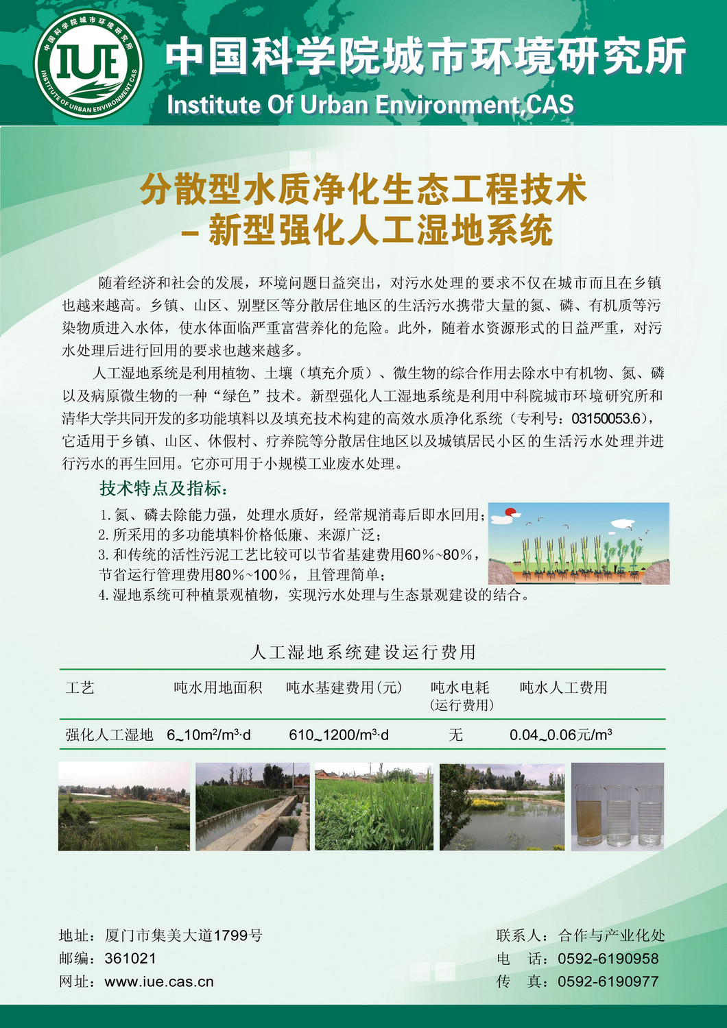 人死湿地系统式利用植物、土壤(填充介质)、微生物的综合利用去除水中有机物、氮、磷以及病原微生物的一种“绿色”技术。新型强化人工湿地系统是利用中科院城市环境研究所和清华大学共同开发的多功能填料以及填充技术构建的高效水质净化系统(专利号:03150053.6)。
