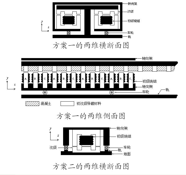 方案二则将长转子固定于地面轮轨之间,将短定子固定在车辆的转向架上。它的优点是建设费用低,系统稳定性高,控制简单。