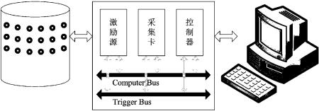 本实用新型涉及一种基于PXI总线的呼吸过程三维电阻抗成像系统,借助于PXI总线高度集成的硬件和软件工具套件,构建三层共48个电极的三维电阻抗成像系统,通过选通开关,依次选择一对相邻的激励电极,向胸腔内注入安全的交流电流,同步采集其余电极上的电压信号,经滤波、放大、模数转换、解调、传输,最后经图像重建算法在计算机上获得呼吸过程中胸腔内部电阻抗敏感区域的分布图像。本系统较已有电阻抗成像系统具有测量精度高、速度快、可靠性高、对人体无损伤、可实现连续实时床旁监护等优点,可供临床连续监测人体肺部呼吸过程变化。