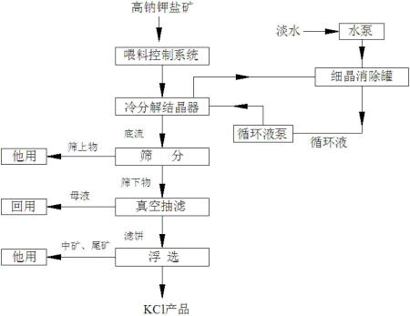 本发明涉及一种高钠钾盐矿的冷分解结晶及浮选方法制备大颗粒氯化钾的系统及工艺,即以高钠钾盐矿为原料,采用冷分解结晶工艺控制及浮选分离获得大颗粒氯化 钾产品的方法,同时根据获得的工艺参数提出实现氯化钾产品粒度控制的结晶器结构及操作参数。本发明针对氯化钠质量百分含量为30%~60%的高钠钾盐矿生 产氯化钾,实现以高钠钾盐矿为原料生产氯化钾过程中对氯化钾晶体产品粒度的控制,获得的产品氯化钾平均粒度为0.15mm~0.35mm,对于进一步优化 选矿厂工程设计的设备选型,提高设备运行的可靠性和稳定性,降低设备运行费用具有重要意义;同时,还可节省生产过程中离心分离操作和干燥过程的运行成本, 降低产品的综合成本。本发明提高了以高钠钾盐矿为原料生产氯化钾产品的市场竞争力,经济效益十分显著,市场前景广阔。