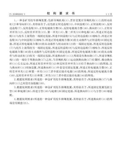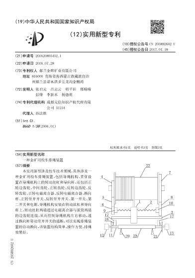 本实用新型涉及绞车技术领域,具体涉及一种金矿用绞车排绳装置,包括导绳机构、贯穿设置在导绳机构上的转动丝杠和导向杆,还包括正转边齿轮、中间齿轮、正转齿轮、反转边齿轮、反转齿轮、正转电磁离合器、反转电磁离合器、换向杆、正转常开开关、反转常开开关、第一开关、第二开关和电源。导绳机构安装在转动丝杠和导向杆上,转动丝杠两端通过电磁离合器与滚筒两端的边齿轮连接,从而控制导绳机构左右移动,通过换向杆带动常开开关的通断,可以实现排绳装置的自动换向,该装置结构简单、操作方便、排绳效果好。