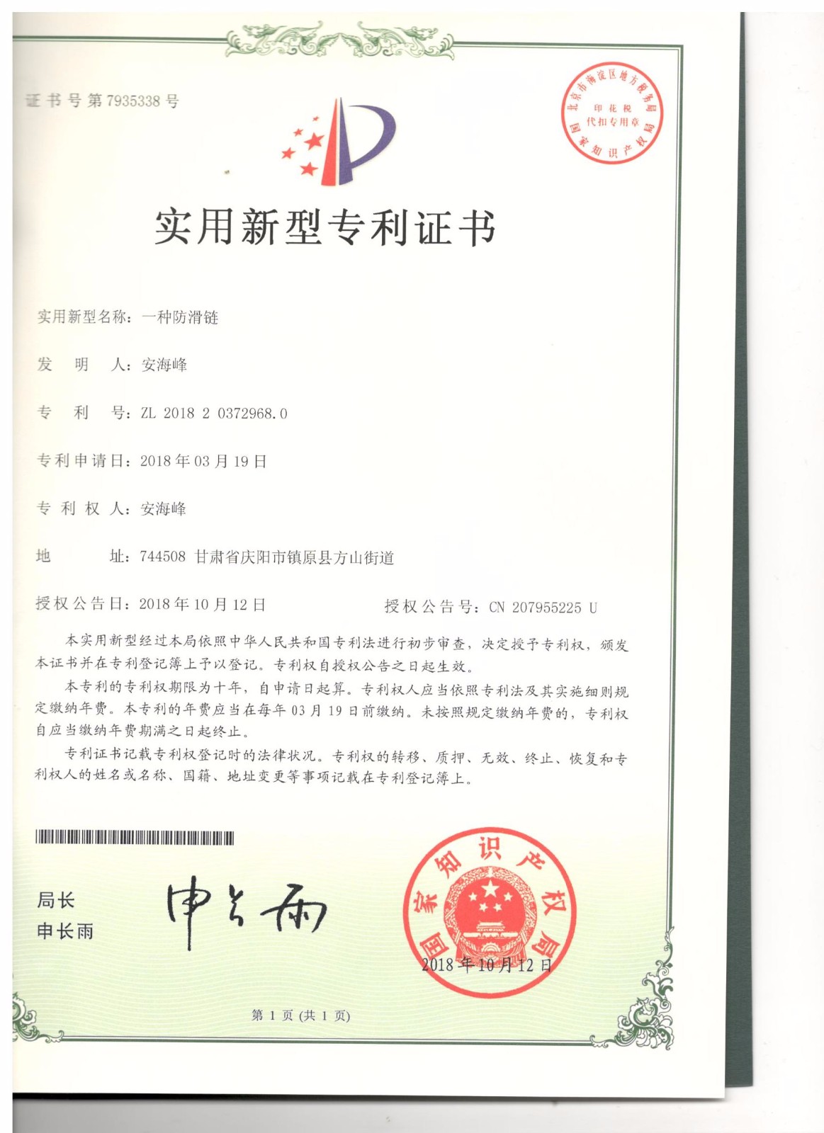 一、本实用新型的一种防滑链由于在胎面设有两端相接形成整圆的第三链条,并且第三链条外表面与轮胎表面为同心圆,这样第三链条不间断与路面的接触,进一步增强了安全行驶的同时,也实现了行驶中平稳、乘坐舒适度好、确保易碎货物完好、节省燃油的效果。