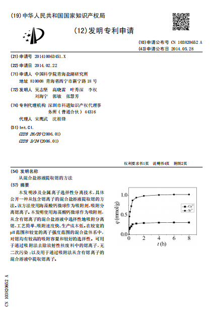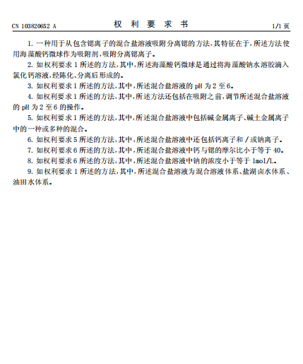 本发明涉及金属离子选择性分离技术,具体公开一种从包含锶离子的混合盐溶液提取锶的方法。该方法使用海藻酸钙微球作为吸附剂,吸附分离锶离子。本发明使用海藻酸钙微球作为吸附剂,从含有锶离子的混合盐溶液中选择性地吸附分离锶,工艺简单、吸附速度快、生产成本低。在较宽的pH范围和较宽的离子强度范围的混合盐体系中,对锶均有较高的吸附容量和较好的选择性。可用于通过吸附法去除放射性核废料中的锶离子,无二次污染;以及用于通过吸附法从含有锶离子的混合溶液中提取锶离子。
